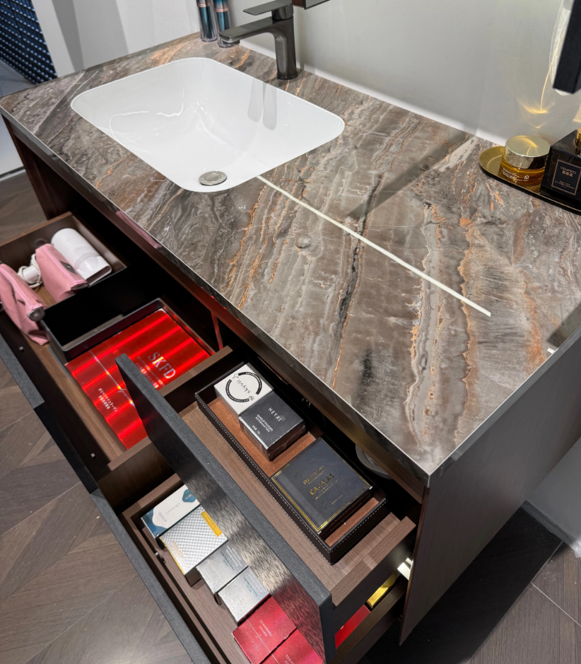 岩板奢石纹理与柜体板材颜色一致,能营造出整体统一、和谐连贯的视觉效果,增强空间的整体!